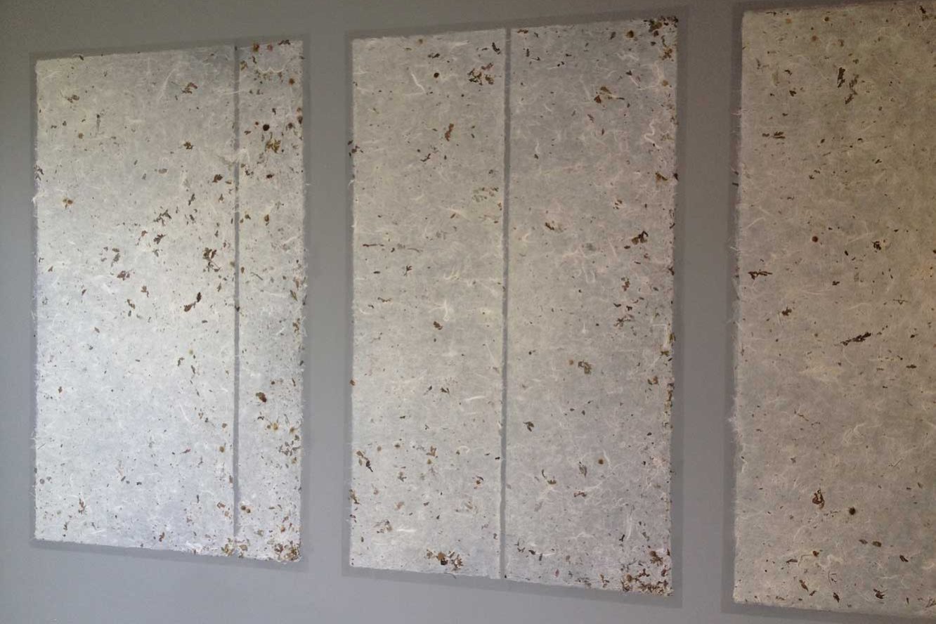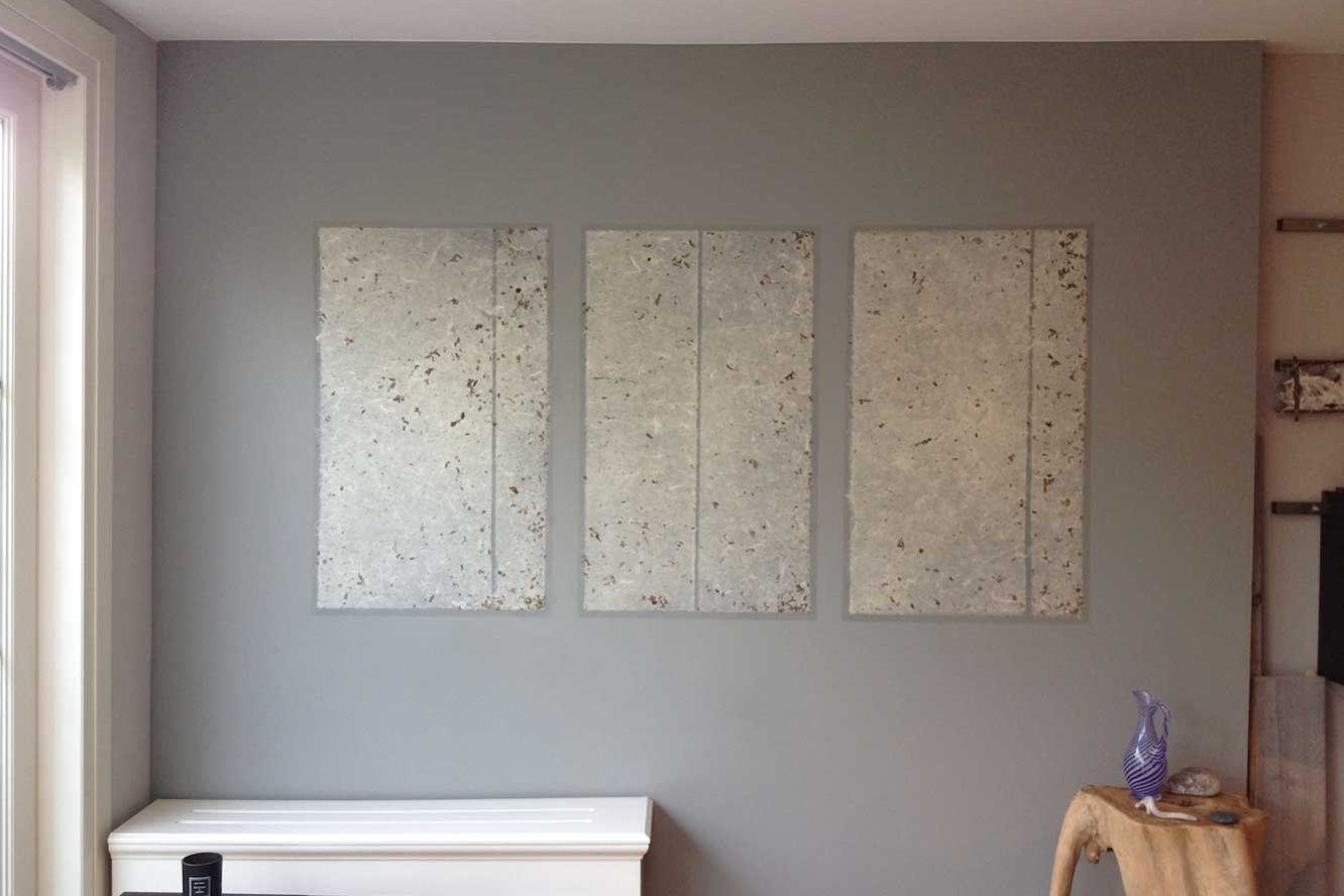 Naast mijn vrije werk maak ik ook werk in opdracht. Vaak betreft het werken die worden gemaakt voor een specifieke plaats in het interieur. De situatie ter plekke is dan bepalend voor het ontwerp en de uitvoering. Hierbij kan ook de akoestiek mee worden genomen. Het papier wordt dan gecombineerd met akoestisch materiaal waarmee een geluiddempend effect wordt verkregen.